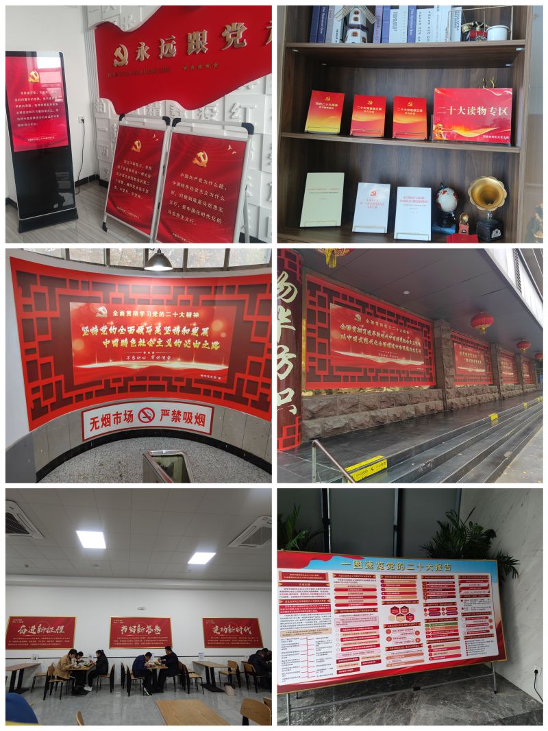 為深入學(xué)習(xí)宣傳貫徹黨的二十大精神,公司各所屬黨支部全方位營(yíng)造濃厚學(xué)習(xí)氛圍:在電梯口、文化走廊、職工食堂等場(chǎng)所懸掛二十大精神金句宣傳展板及橫幅;在休息區(qū)增設(shè)二十大圖書(shū)角,放置二十大精神學(xué)習(xí)圖書(shū)及相關(guān)輔導(dǎo)讀本;利用電子屏幕滾動(dòng)播放二十大精神金句圖片,在職工食堂用電視播放中國(guó)共產(chǎn)黨國(guó)際形象網(wǎng)宣片、二十大微視頻等,讓大家“抬頭看得見(jiàn)、隨處可以學(xué)、時(shí)時(shí)能感受”,積極營(yíng)造出了全面貫徹學(xué)習(xí)黨的二十大精神的濃厚學(xué)習(xí)氛圍,引導(dǎo)全體黨員干部職工在學(xué)習(xí)中明方向,在感悟中找坐標(biāo),全方位、多角度地宣貫二十大精神影響力。