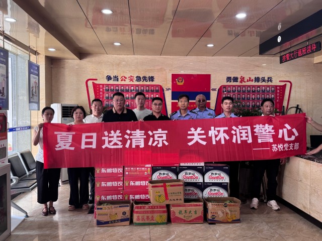在王陵派出所,蘇悅黨支部一行向派出所負責(zé)人及民警代表送上了精心準備的防暑降溫慰問品,包括清涼解渴的礦泉水、甘甜爽口的西瓜以及藿香正氣水、風(fēng)油精等實用防暑藥品。物資承載著蘇悅黨支部對一線民警辛勤付出的真誠感謝,傳遞著“警企一家親”的濃濃情意。