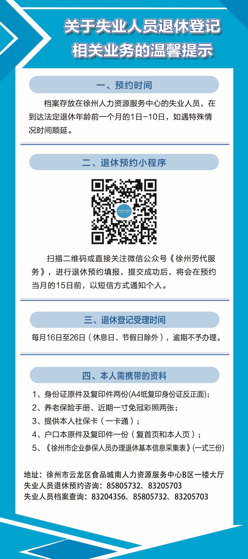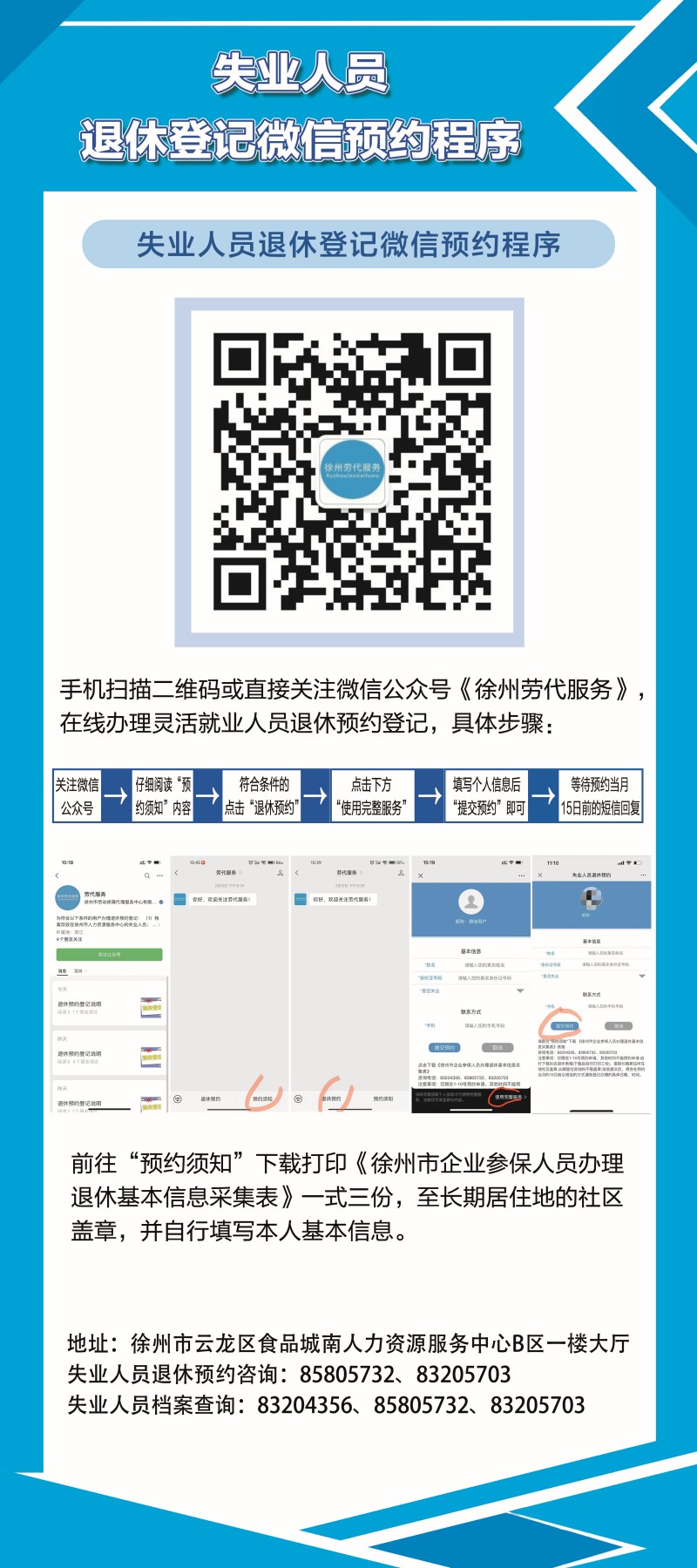 自3月1日起,凡符合以下兩個條件的退休人員,只需在到達(dá)法定退休年齡前一個月的10日內(nèi),關(guān)注微信公眾號“勞代服務(wù)”,即可辦理預(yù)約登記:(1)檔案存放在徐州市人力資源服務(wù)中心的失業(yè)人員;(2)未參加過工作,異地戶口以個體繳納徐州市本市養(yǎng)老保險的純個體人員。