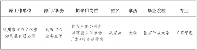 根據(jù)《徐州市國(guó)有資產(chǎn)投資經(jīng)營(yíng)集團(tuán)有限公司招聘工作人員公告》規(guī)定程序,招聘工作經(jīng)過報(bào)名、資格審查、面試等程序,現(xiàn)將公開招聘擬錄用人員名單進(jìn)行公示。公示期自2023年4月20日起至4月25日止。如對(duì)公示對(duì)象錄用資格有異議的,請(qǐng)于公示期內(nèi)向國(guó)投環(huán)能公司黨群與人力資源部反映。