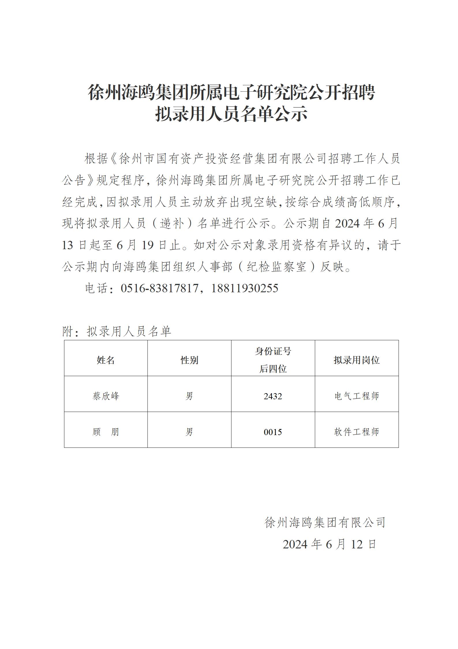 徐州海鷗集團(tuán)所屬電子研究院公開(kāi)招聘擬錄用人員名單公示