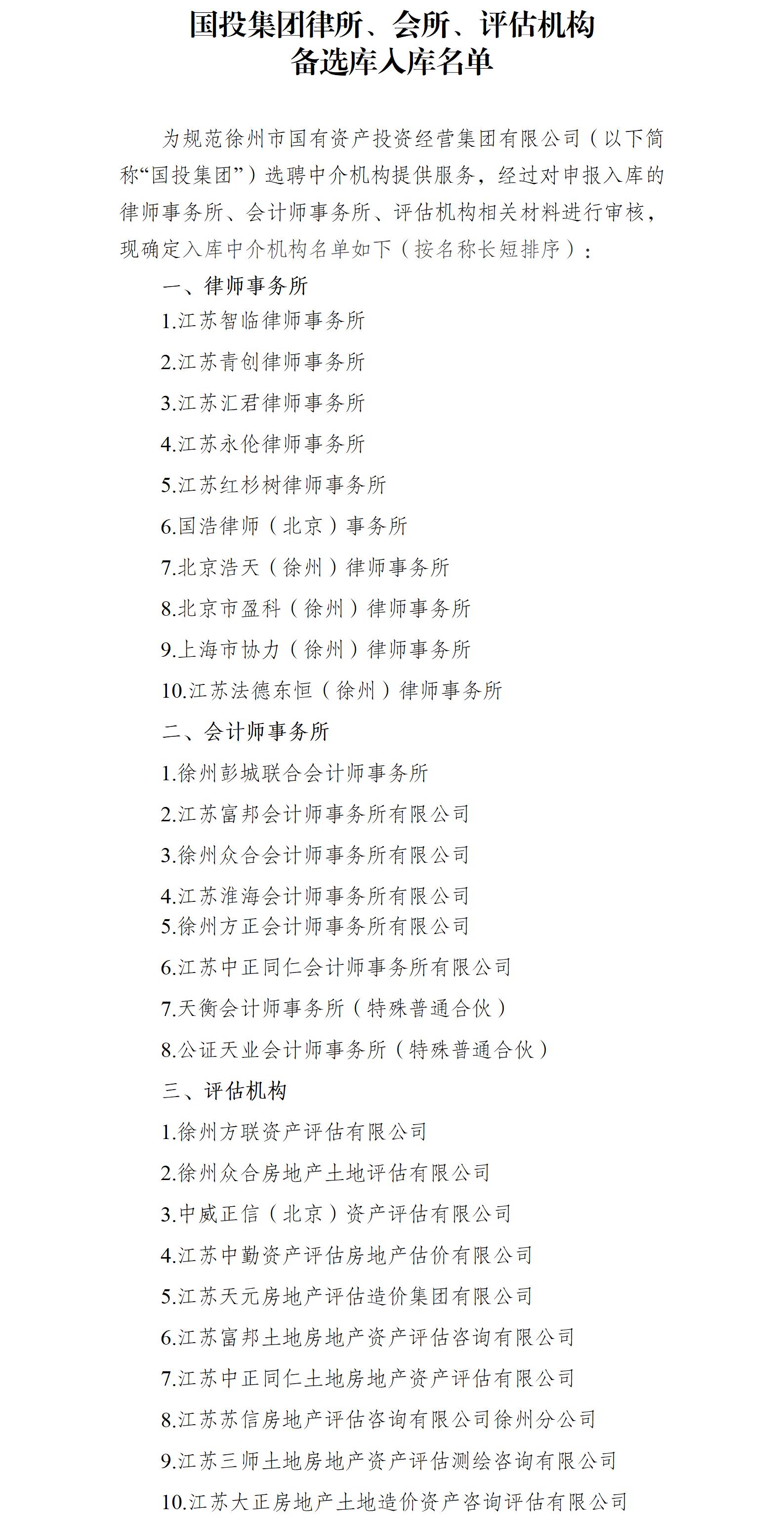 國投集團律所、會所、評估機構(gòu)備選庫入庫名單