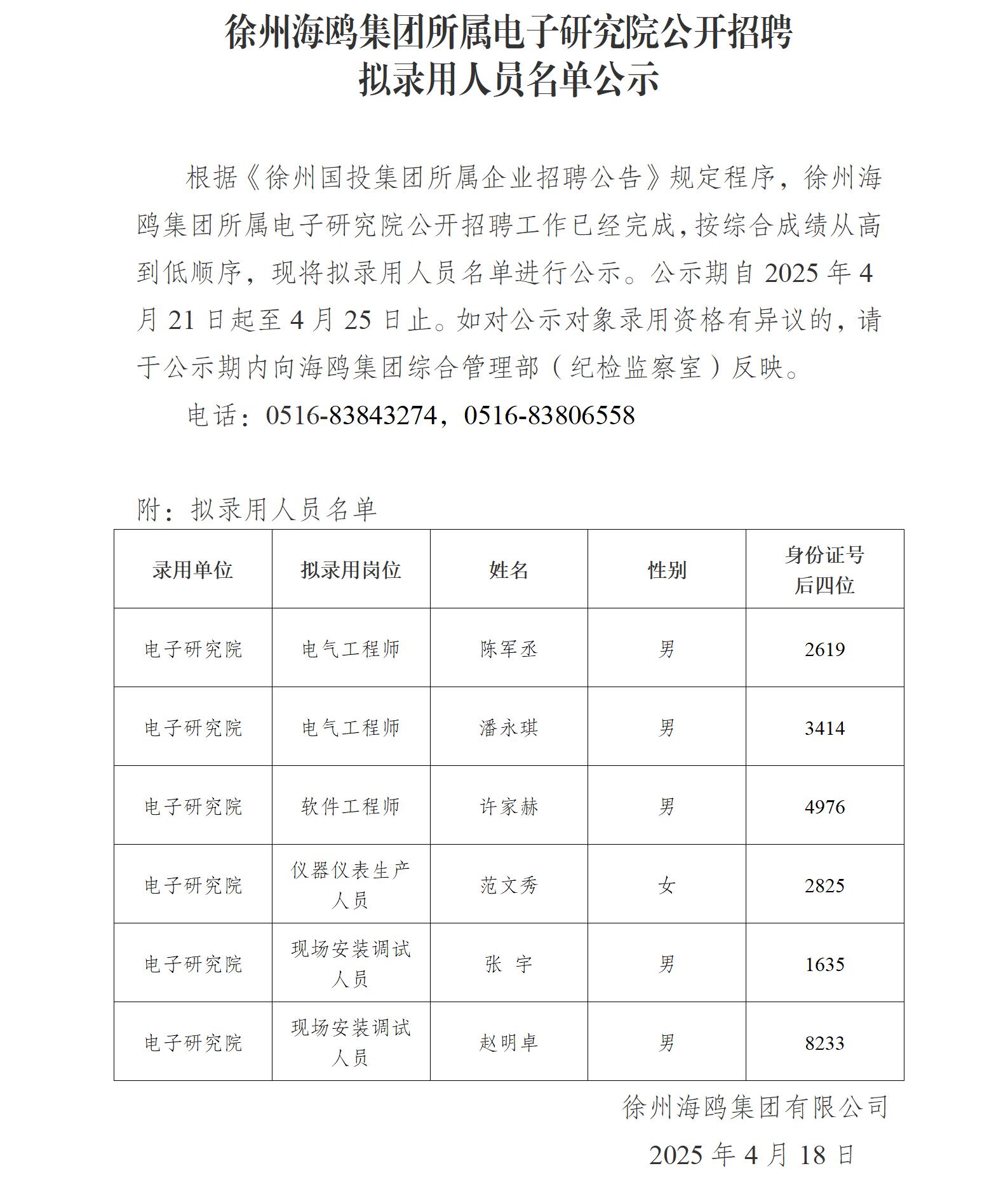 徐州海鷗集團(tuán)所屬電子研究院公開招聘擬錄用人員名單公示