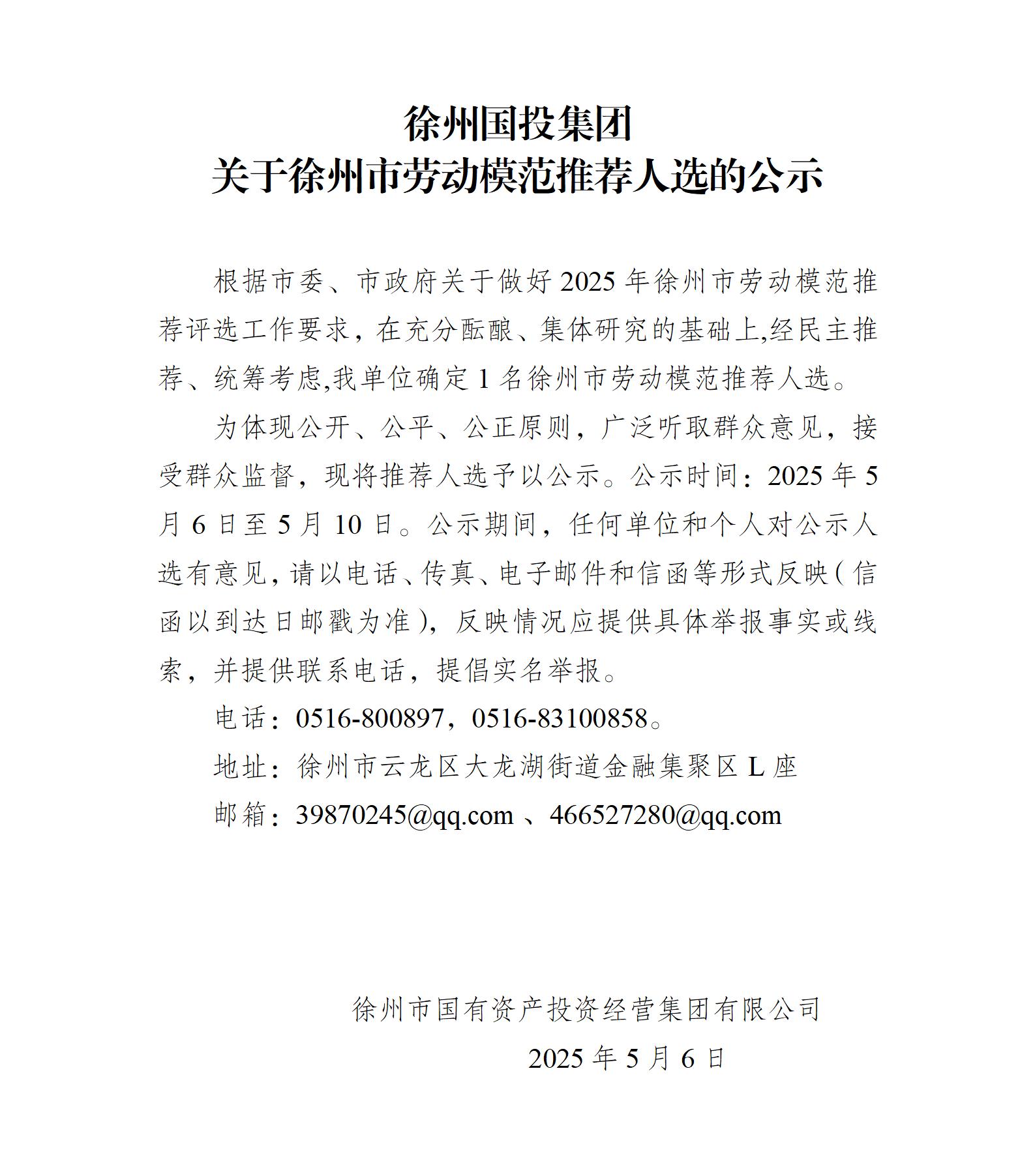 徐州國投集團(tuán)關(guān)于徐州市勞動模范推薦人選的公示