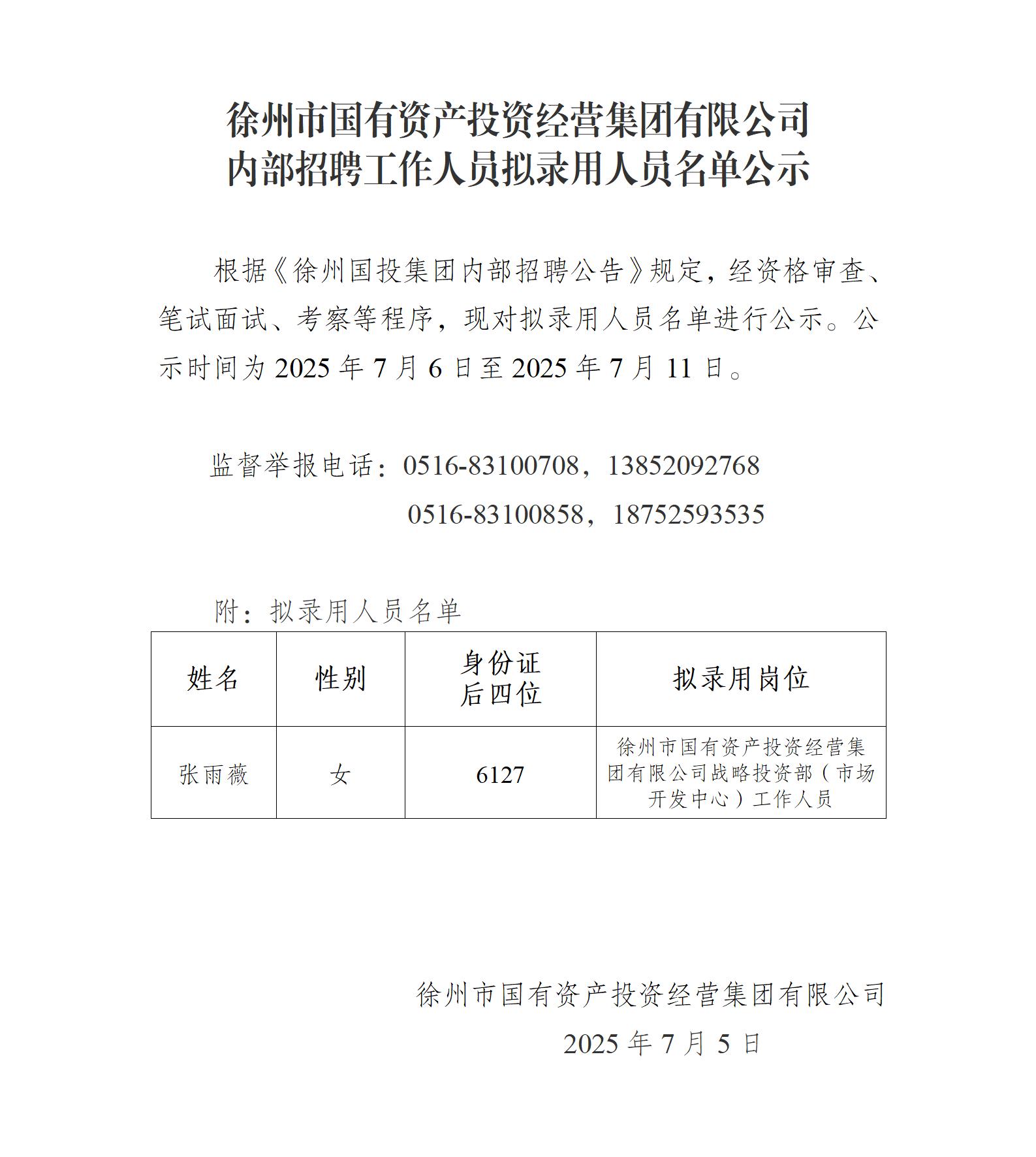 徐州國(guó)投集團(tuán)內(nèi)部招聘工作人員擬錄用人員名單公示