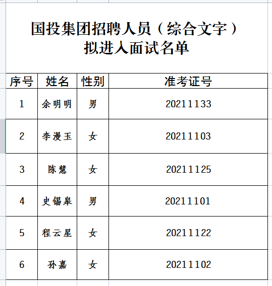 人員擬進(jìn)入面試人員名單公示