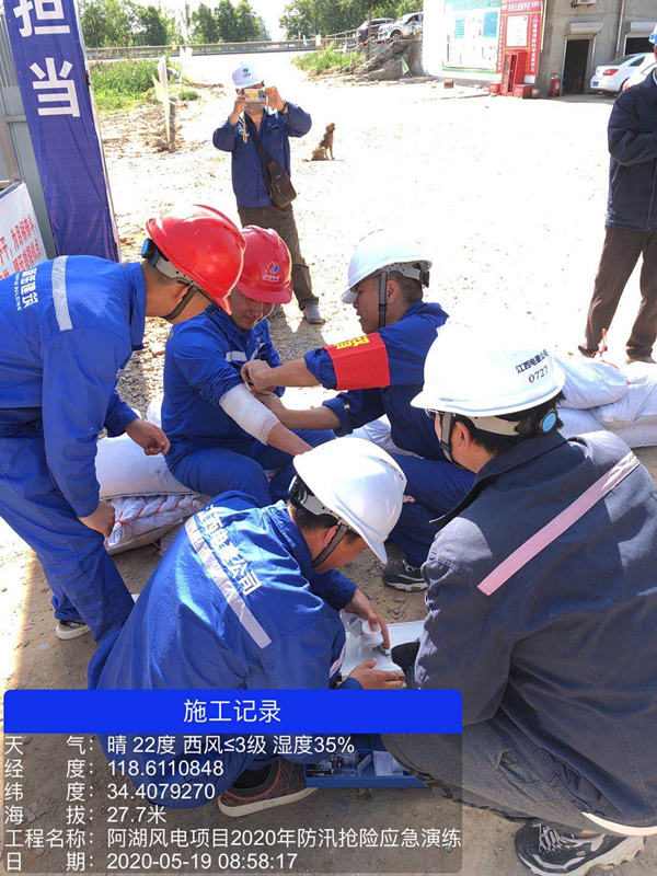 擬定5月19日上午9時(shí),新沂市阿湖鎮(zhèn)區(qū)域突發(fā)局部強(qiáng)降雨,導(dǎo)致升壓站施工區(qū)洪水爆發(fā),升壓站值勤人員立刻向現(xiàn)場(chǎng)值班領(lǐng)導(dǎo)及防汛總指揮報(bào)告??傊笓]接到報(bào)告后,立刻啟動(dòng)應(yīng)急預(yù)案。搶險(xiǎn)救援隊(duì)集合完畢,分為兩隊(duì)進(jìn)行搶險(xiǎn)救災(zāi),第一隊(duì)搶救重要物資,轉(zhuǎn)移至高地,另一隊(duì)組織突擊隊(duì)員用沙袋在升壓站門口堆砌擋水墻,阻斷洪水進(jìn)入,同時(shí)組織裝載機(jī)、推土機(jī)修復(fù)便道,恢復(fù)交通,保證撤離路線暢通。上午11時(shí)洪水退卻,各小組清點(diǎn)人數(shù)后向指揮部報(bào)告,除一名傷員送往醫(yī)院外(演練設(shè)定),全部人員安全在場(chǎng),演練取得圓滿成功。