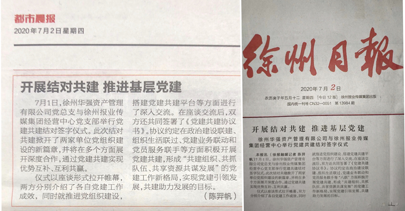 為深入貫徹黨的十九大精神,扎實推進習近平新時代中國特色社會主義思想學懂弄通做實,著力發(fā)揮黨建引領(lǐng)鑄魂聚力功能,不斷提升基層黨組織組織力、引領(lǐng)力、凝聚力。7月1日上午,適逢中國共產(chǎn)黨成立99周年華誕之際,徐州華強資產(chǎn)管理有限公司黨總支同徐州報業(yè)傳媒集團經(jīng)營中心黨支部開展黨建結(jié)對共建活動,以一支一項“報業(yè)企業(yè)手拉手,助力兩新企業(yè)發(fā)展”為主題,形成“共建組織、共抓隊伍、共享資源,共謀發(fā)展”的基層黨建工作新格局,進一步加強基層黨組織隊伍建設(shè),實現(xiàn)優(yōu)勢互補,促進改革創(chuàng)新,充分發(fā)揮基層黨組織的戰(zhàn)斗堡壘作用。7月2日徐州報業(yè)集團分別在徐州日報及都市晨報對此進行刊登報道。