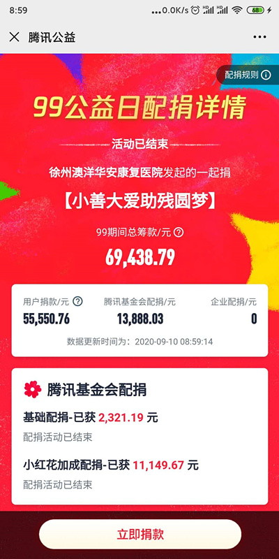 國泰投資所屬各單位積極響應(yīng)“99公益日”活動號召,認真研究配捐集小紅花獲取配捐活動規(guī)則,力求最大程度獲得騰訊公益平臺的配捐額度。活動以澳洋華安醫(yī)院黨支部為發(fā)起單位、全體黨員干部職工為主力軍,組建了國泰投資先鋒隊等十余支愛心助捐團隊,分工明確、密切配合,集中在9月7、8、9日三天進行募捐、點贊集小紅花獲取配捐。截止9月9日,共籌集善款(含配捐)69438.79元(其中國泰投資募集善款22112元)。