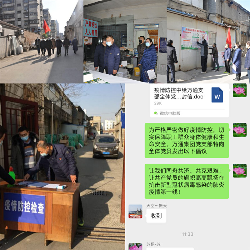 萬通集團(tuán)黨支部通過學(xué)習(xí)強(qiáng)國(guó)會(huì)議平臺(tái)傳達(dá)集團(tuán)公司疫情防控文件精神和商辦工業(yè)公司疫情防控工作部署,并在黨員微信群發(fā)出倡議:“讓我們同舟共濟(jì)、共克艱難!讓共產(chǎn)黨員的旗幟高高飄揚(yáng)在抗擊新冠肺炎疫情的第一線!”1月18日下午,在支部書記張安民同志的帶領(lǐng)下,黨員先鋒隊(duì)全體隊(duì)員來到公司所屬商機(jī)廠,分工分頭開展工作,有的懸掛疫情防控宣傳展板、分發(fā)疫情防控知識(shí)手冊(cè),有的在防控崗登記測(cè)溫、向業(yè)戶發(fā)放倡議書,大家干得熱火朝天,忘記了天寒、忘記了時(shí)間。