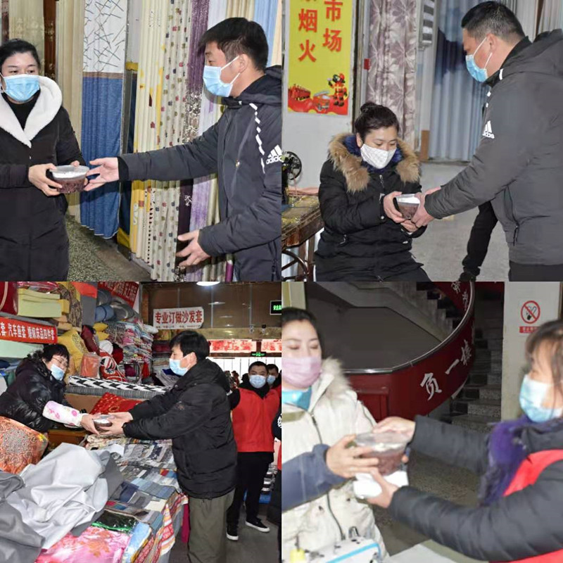 “過了臘八就是年”。今年臘八節(jié)恰逢大寒節(jié)氣,早上6點,工作人員便早早來到市場,將提前準(zhǔn)備好的優(yōu)質(zhì)糯米、黑米、花生米、蕓豆、紅豆、葡萄干、紅棗等食材清洗干凈,經(jīng)過近5個小時的熬制,一碗碗熱氣騰騰、濃郁糯香的臘八粥終于完成。因疫情原因,今年取粥的形式從以往排隊領(lǐng)取轉(zhuǎn)變?yōu)橛晒ぷ魅藛T逐層逐戶送到商戶手中,送的是粥暖的是心,商戶們喝著甜蜜的臘八粥,臉上洋溢著開心的笑容。