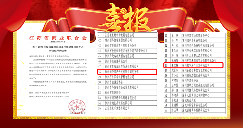 近日,華強黨總支物華黨支部因在2020年度抗擊新冠肺炎疫情工作中表現(xiàn)突出,被江蘇省商業(yè)聯(lián)合會評為“江蘇省商業(yè)聯(lián)合會2020年度抗疫和社團工作先進單位”,物華黨支部書記查文靜同志榮獲“抗疫和社團工作先進個人”。
