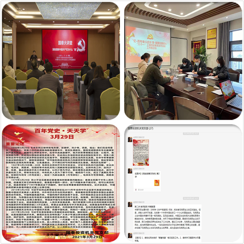 為貫徹落實集團公司黨委關于黨史學習教育工作部署要求,進一步深化《國泰投資黨總支關于“六個一”工程四史教育系列活動方案》文件要求,國泰投資提前謀劃,精心部署,把黨史學習教育作為推動凝心聚力和加強黨性教育的有力抓手,通過突出“四個強化”確保黨史學習教育開局有影響、有聲勢。