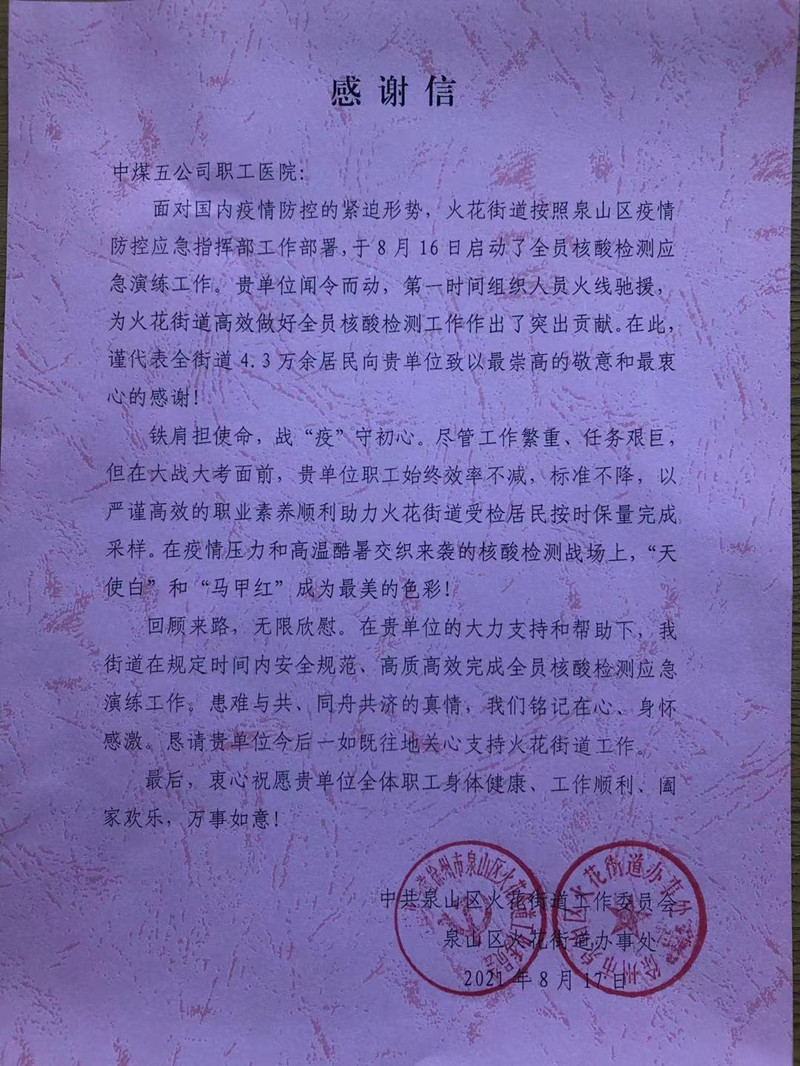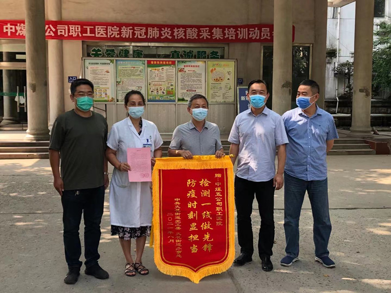 8月19日上午,泉山區(qū)火花辦事處領(lǐng)導(dǎo)一行來到中煤五公司職工醫(yī)院,并送上感謝信和錦旗,表示“在中煤五公司職工醫(yī)院的大力支持和幫助下,街道在規(guī)定時間內(nèi)安全規(guī)范、高質(zhì)高效完成全員核酸檢測應(yīng)急演練工作。患難與共、同舟共濟得 真情我們銘記在心、身懷感激”。院黨委書記宋俊祥代表全院參戰(zhàn)職工接受感謝信和錦旗,并表示今后將一如既往支持街道辦事處工作,共同戰(zhàn)役、共擔(dān)使命。
