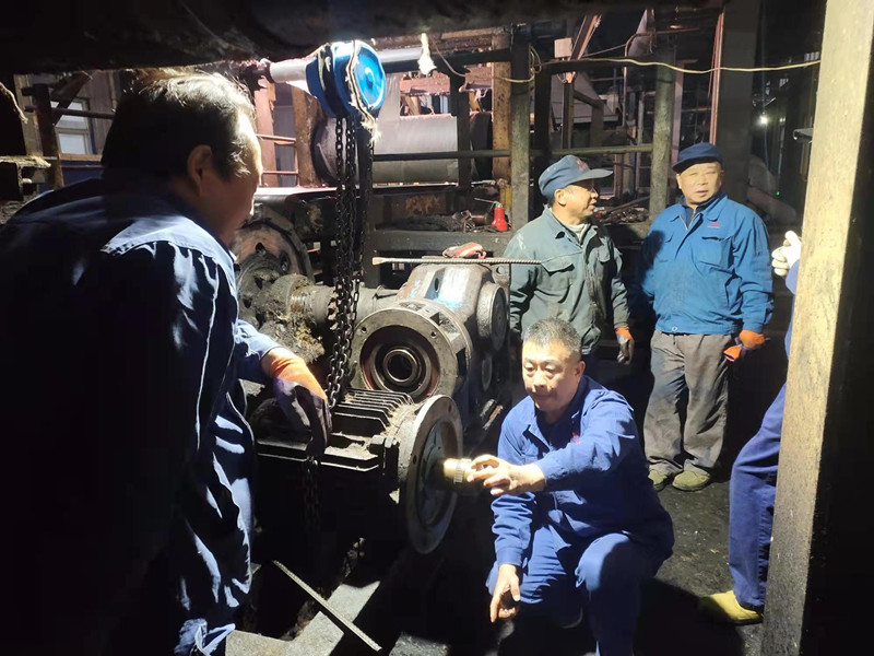 功夫不負有心人,經(jīng)過仔細測量,發(fā)現(xiàn)電機和減速機的聯(lián)軸器部分花鍵磨損,使得減速機和電機脫離,造成動力丟失。找到癥結(jié)后,大家雖如釋重負,但一刻也沒有停歇,而是選擇繼續(xù)奮戰(zhàn),對聯(lián)軸器部位重新定位安裝,其他設(shè)備也全部安裝恢復(fù),確保尺寸正確后裝機運轉(zhuǎn),試運行顯示正常,掌聲不約而同地劃破寂靜的車間。