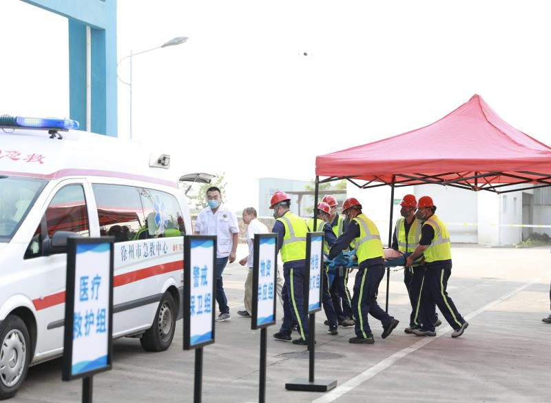 本次應(yīng)急演練活動(dòng)現(xiàn)場(chǎng)位于危廢處置中心危險(xiǎn)廢物焚燒車間,模擬場(chǎng)景設(shè)計(jì)為巡檢人員在更換窯頭噸桶廢液時(shí),由于操作不當(dāng),回流管從收集桶中甩出至地面,廢液飛濺到巡檢人員額面部,造成灼傷。同時(shí),廢液濺至回轉(zhuǎn)窯周邊遇熱燃燒,并點(diǎn)燃回流管不斷涌出的廢液。事故發(fā)生后,危廢中心應(yīng)急救援隊(duì)伍各司其職,消防與搶險(xiǎn)救災(zāi)組使用滅火器、消火栓、消防水炮霧化滅火;警戒保衛(wèi)組對(duì)事故現(xiàn)場(chǎng)警戒;醫(yī)療救護(hù)組對(duì)受傷人員進(jìn)行心肺復(fù)蘇急救,將受傷員工外送就醫(yī);環(huán)境保護(hù)組打開(kāi)應(yīng)急水池閘門,做好消防水及洗消水的收集工作。通過(guò)各現(xiàn)場(chǎng)應(yīng)急救援組織機(jī)構(gòu)協(xié)同努力,緊急情況得以解除,現(xiàn)場(chǎng)經(jīng)洗消檢驗(yàn)后恢復(fù)正常狀態(tài)。