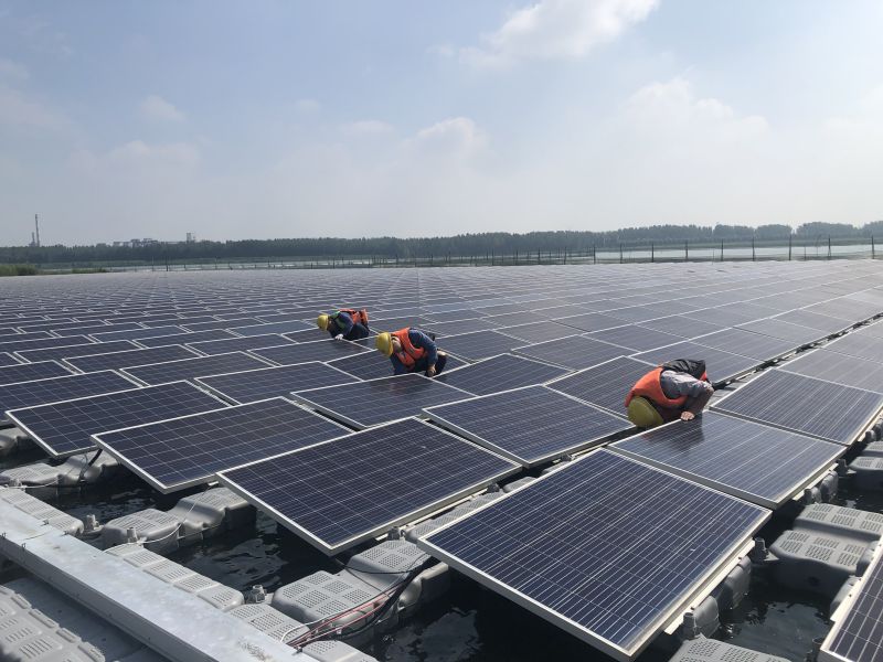 熱浪翻滾,淮北鑫能電站運維人員正小心翼翼的在浮筒上穿行,檢查光伏組件MC4接頭是否有脫落。狹窄的浮筒通道上,他們或趴或坐在浮筒上,對破損的電纜通道浮筒和故障逆變器進行更換。經(jīng)過猛烈的日光折射,水面上形成了一股熱氣,上烤下蒸的模式使得救生衣里面衣衫濕透,分不清是汗水還是湖水。