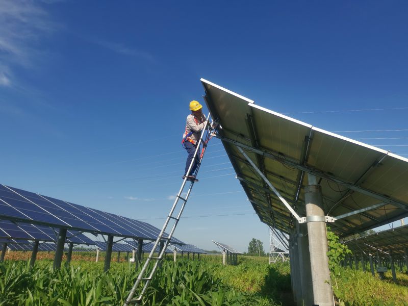 安徽區(qū)域的地面光伏場站較為分散,光伏區(qū)遍布茂密的農(nóng)作物或雜草,完成一次巡視需要大量的人力與時間。光伏板經(jīng)過烈日曬烤,散發(fā)陣陣熱浪,宿州協(xié)鑫、碭山協(xié)鑫、碭山鑫能電站的運維人員剛剛開展一次登高作業(yè),在地面小伙伴的配合下,完成了對故障光伏組串的維修。熾熱的火傘高張在空中,高處的風并沒有送來涼爽的感覺,被暴曬過的支架盡管隔著工作服,仍能感受到它的炙熱。