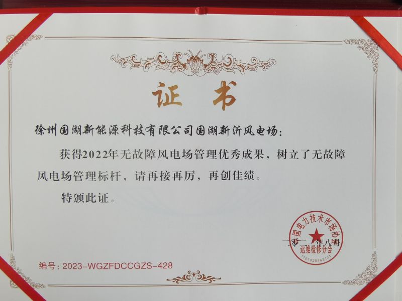 8月24日,徐州國湖新能源科技有限公司所屬國湖新沂風(fēng)電場(chǎng)榮獲中國電力技術(shù)市場(chǎng)協(xié)會(huì)頒發(fā)的“2022年無故障風(fēng)電場(chǎng)管理優(yōu)秀成果”獎(jiǎng)項(xiàng)。