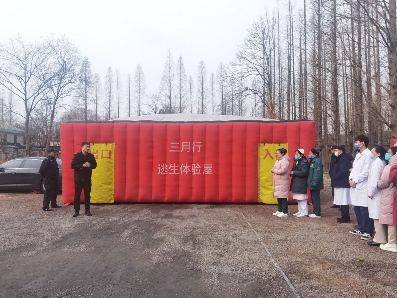 為了貼近實戰(zhàn),讓大家真實體驗火災(zāi)來臨時的緊迫感,現(xiàn)場設(shè)置了充氣式疏散逃生體驗屋,通過設(shè)置煙霧等方式模擬火災(zāi)現(xiàn)場。醫(yī)院邀請了“三月行”安全公司郭教員對參加演練職工進(jìn)行了簡短的培訓(xùn),強調(diào)了進(jìn)入消防體驗屋后的注意事項,參加演練人員分組進(jìn)行演練。在郭教員的指引下,參加演練的人員彎腰捂鼻,依次進(jìn)入消防逃生屋,在彌漫著濃重的煙霧中摸索著彎膝前進(jìn),順利找到了出口逃生,演練在井然有序的氛圍下完成。