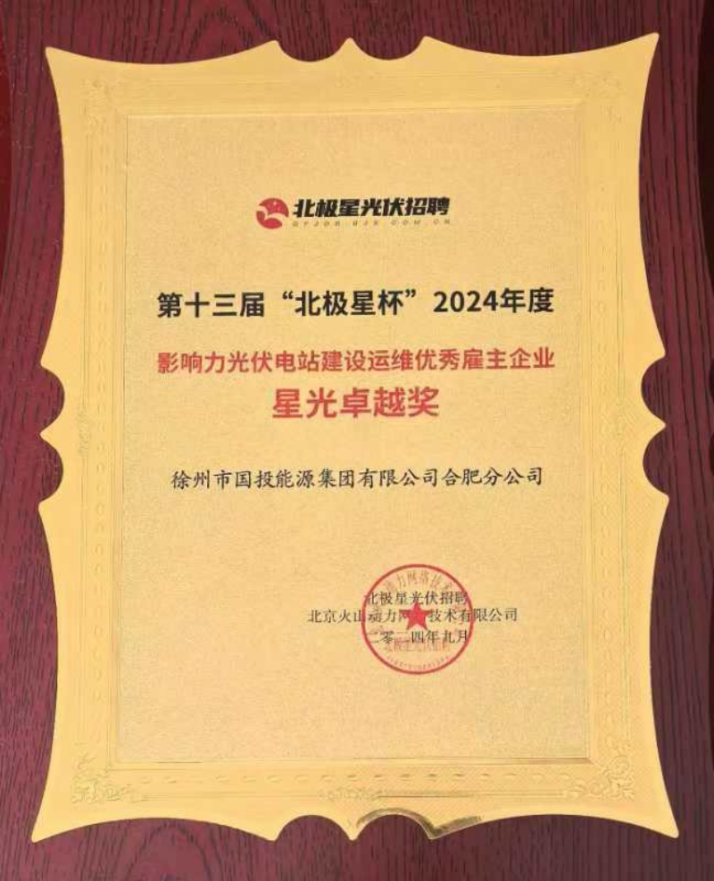 9月5日,在光伏行業(yè)備受矚目的“北極星杯”光伏影響力品牌評選中,能源集團合肥分公司脫穎而出,成功斬獲第十三屆“北極星杯”2024年度影響力光伏電站建設(shè)運維優(yōu)秀雇主企業(yè)星光卓越獎。