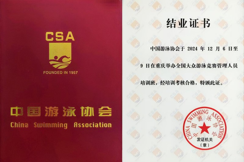 12月6-9日,國(guó)體徐州競(jìng)賽組織管理人員參加中國(guó)游泳協(xié)會(huì)組織的“2024年全國(guó)大眾游泳競(jìng)賽管理人員培訓(xùn)”,取得結(jié)業(yè)證書(shū),獲得了承辦體育總局游泳中心、中國(guó)游泳協(xié)會(huì)主辦的大眾游泳比賽的資質(zhì)。