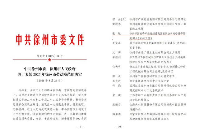 2025年5月28日,徐州市勞動(dòng)模范表彰大會(huì)召開(kāi),徐州國(guó)投集團(tuán)戰(zhàn)略投資部副部長(zhǎng)(主持工作)張敏榮獲“徐州市勞動(dòng)模范”稱(chēng)號(hào)!
