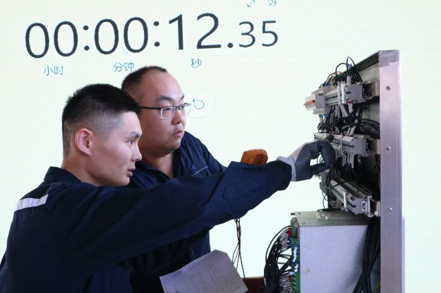 練兵場亦是競技臺。15時30分,高壓開關柜回路故障消缺實操比賽開始。多支參賽隊伍輪番上陣,在裁判嚴格監(jiān)督下展開較量。面對預設的復雜回路故障,選手們身著統(tǒng)一工裝,佩戴齊整防護,審閱圖紙、測試分析、精準排障。每一次舉手示意操作、每一次工具精準落點,都體現(xiàn)著“安全第一、規(guī)范先行”的鐵律。賽場氣氛緊張激烈,選手們沉著冷靜的故障診斷能力與嫻熟的動手能力贏得陣陣贊嘆。