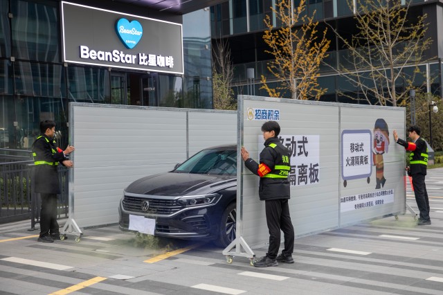 隨后,開(kāi)始進(jìn)行新能源汽車自燃應(yīng)急處置演練,演練使用了招商積余物業(yè)針對(duì)新能源汽車自燃的專業(yè)滅火裝置,可以快速有效處置新能源汽車底部自燃情況。