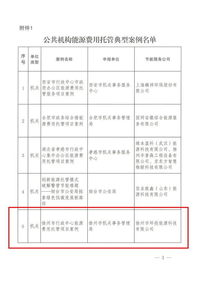 近日,國(guó)管局辦公室、國(guó)家發(fā)展改革委辦公廳、財(cái)政部辦公廳聯(lián)合發(fā)文,發(fā)布全國(guó)公共機(jī)構(gòu)能源費(fèi)用托管30個(gè)典型案例和25個(gè)入圍案例名單,徐州市環(huán)投能源科技有限公司(簡(jiǎn)稱“環(huán)投公司”)托管服務(wù)的《徐州市行政中心能源費(fèi)用托管項(xiàng)目》被評(píng)定為典型案例。