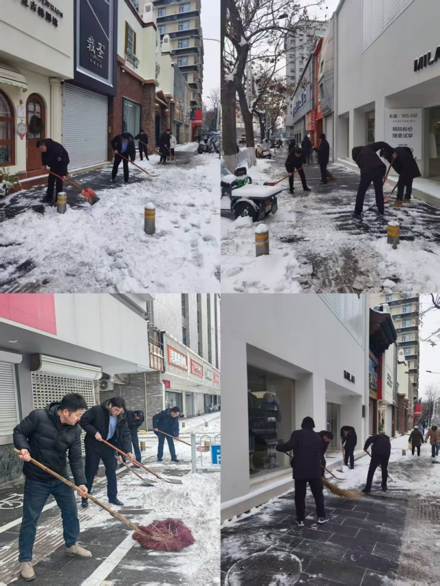 大家不畏嚴(yán)寒,手持鐵鍬、掃帚、除雪鏟、融雪劑等工具,分成多個(gè)小組,迅速前往中山路、淮海西路等沿街租賃區(qū)域。大家分工明確,配合默契,有的奮力鏟除冰層,有的仔細(xì)清掃積雪……在凜冽的寒風(fēng)中,形成了一道堅(jiān)守奉獻(xiàn)、溫暖人心的風(fēng)景線。經(jīng)過(guò)數(shù)小時(shí)的連續(xù)奮戰(zhàn),積雪和堅(jiān)冰被徹底清除,行人和車輛通行道路暢通無(wú)阻。這不僅為租戶們打通了一條安全經(jīng)營(yíng)、高效運(yùn)營(yíng)的“綠色通道”,也為市民們提供了一條安全出行、舒心暢行之路。