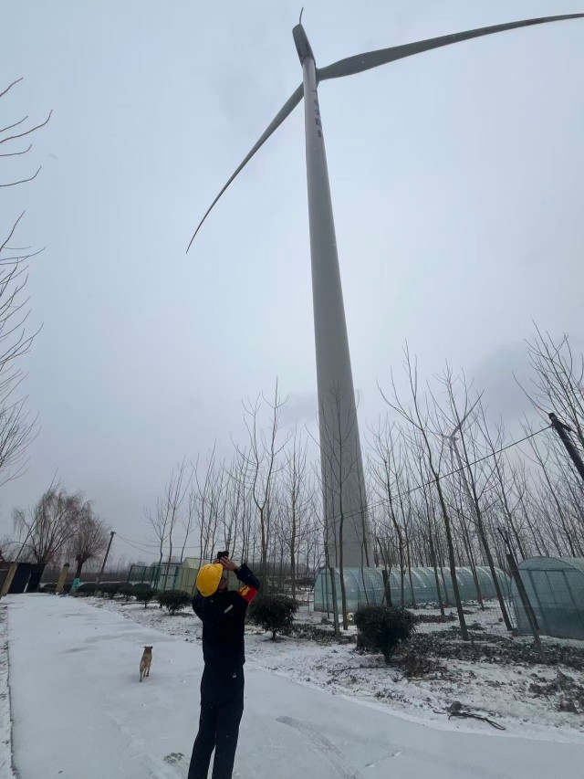 作業(yè)過程中,運維人員嚴格執(zhí)行“先關(guān)鍵設(shè)備、后輔助區(qū)域”原則,全員投入除雪保供一線。大家手持鐵鍬、掃帚等工具,全力清理升壓站主干道積雪積冰,搶通設(shè)備巡檢“生命線”,保障巡檢作業(yè)順利開展。充分運用無人機、望遠鏡、紅外測溫儀等設(shè)備,重點排查風(fēng)機葉片覆冰、集電線路有無異常等情況,同時組織人員逐戶上門發(fā)放《風(fēng)機覆冰安全告知書》,詳細告知風(fēng)機附近居民風(fēng)機覆冰可能引發(fā)的墜冰風(fēng)險,重點提醒居民在雨雪冰凍天氣減少戶外逗留、遠離風(fēng)機塔筒及葉片旋轉(zhuǎn)覆蓋區(qū)域,切實筑牢設(shè)備安全運行與居民人身安全“雙防線”。
